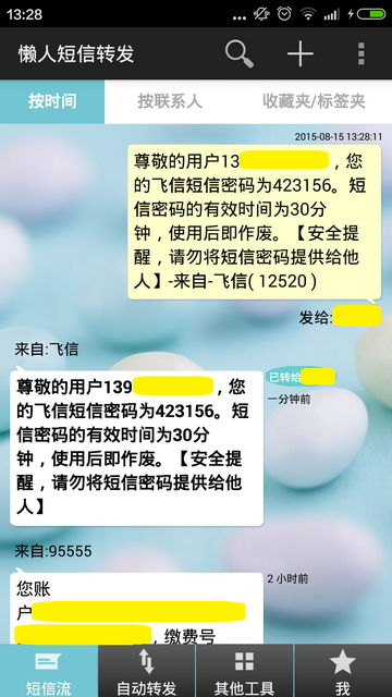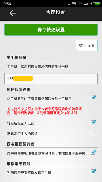 这个界面能帮您快速建立简单的转发规则:即所有的短信都转给某个号码(主手机)