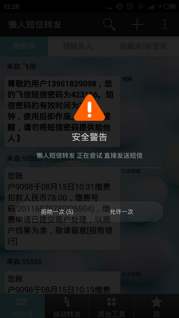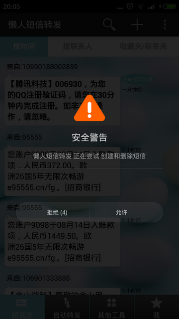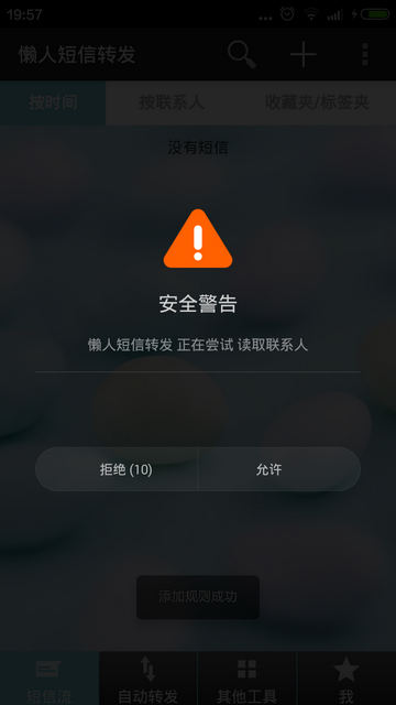 选择允许,因为懒人短信要读取短信列表才能进行短信显示和转发.