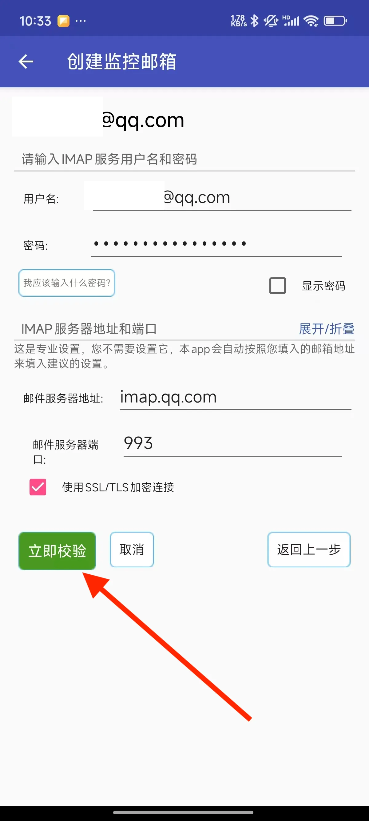 注意这个步骤的密码可能是授权码,这个要看你的邮箱设置帮助文档。例如我举例的QQ邮箱,就需要先在QQ邮箱的官网登录后生成一个授权码,然后才能用IMAP方式监控。